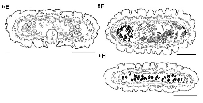 Fig. 5. Cross-sections of Wenyonia spp. in the testicular (E), uterine (F) and postovarian regions (H). E, F, H, W. longicauda Woodland, 1937. Abbreviations: ov, ovary. Scale-bars: E, 500µm; F, 250µm; H, 200µm.