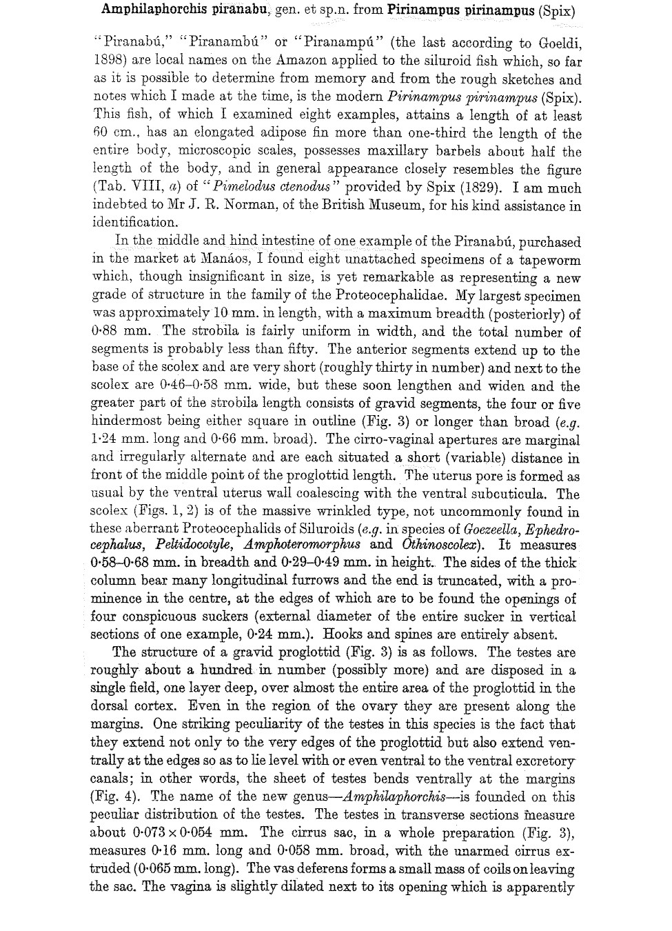 Woodland, W. N. F. 1934. On the Amphilaphorchidinae, a new subfamily of proteocephalid cestodes, and Myzophorus admonticellia, gen. et sp. n., parasitic in Pirinampus spp. from the Amazon. Parasitology 26: 141-149 + Plate . (3961) Download PDF |