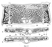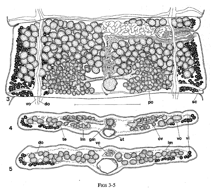 Brooksiella praeputialis (Rego, Santoa & Silva, 1974). e. INVE 21996, mature proglottis, dorsal view. 4-5. INVE 22059, pregravid proglottis, cross sections at level of ovary and at level of middle of middle of the proglottis. Note the follicular structure of ovary and the lateral and ventral position of vitelline follicles. Abbreviations: do: dorsal osmoregulatory canal; gm, Mehlis glands; lm, internal longitudinal musculature; ov, ovary; po : transverse osmoregulatory canal; sc : secondary canal; te: testes; ut: uterus; vc: vaginal canal; vi: vitellaria; vo: ventral osmoregulatory canal. Scale-bar: 500 µm.