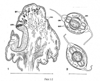 Brooksiella praeputialis (Rego, Santos & Silva, 1974), INVE 22059. 1. Fontral section of the scolex, showing the concentration of gland(?) cells and dense network of osmoregulatory canals beneath the apical part. Note also the muscular fibres situated in the anterior part of the sucker. 2. Eggs drawn in distilled water. Abbreviations: cm, internal circular musculature; em, embryophore; gc, gland cells; oc, osmoregulatory canals; oe, outer envelope; on, oncosphere. Scale-bars: 1 = 500 µm; 2 = 20 µm.