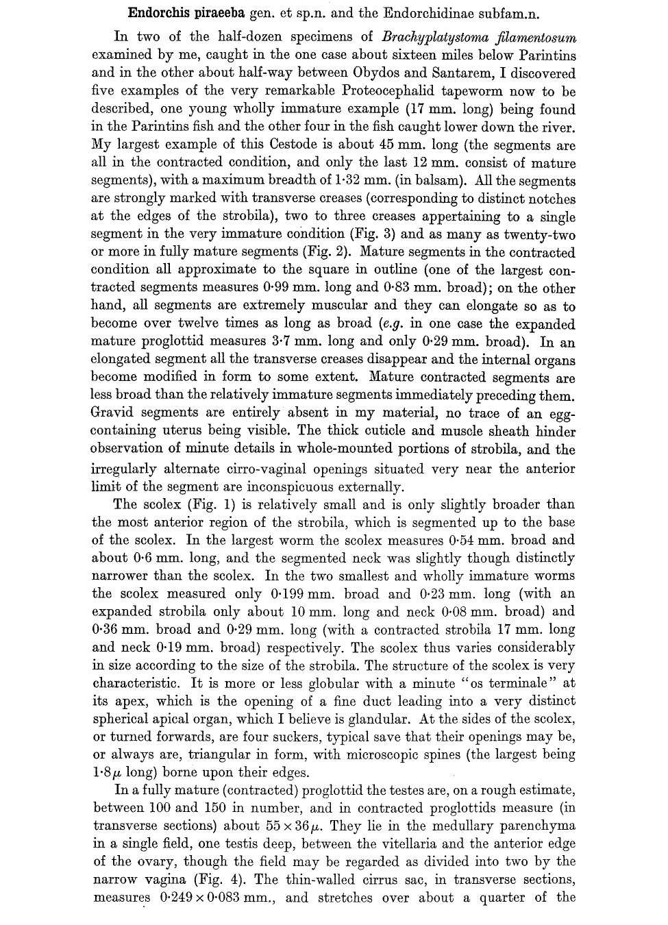 Woodland, W. N. F. 1934. On some remarkable new cestodes from the Amazon siluroid fish, Brachyplatystoma filamentosum (Lichtenstein). Parasitology 26: 268-277+Plate X. (3962) Download PDF |