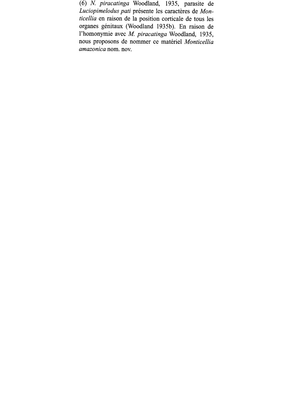 | Scientific Name Notes | -proposed as a replacement name for Nomimoscolex piracatinga Woodland, 1935 because of homonymy with Monticellia piracatinga Woodland, 1935 -Rego et al. (1999) mistakenly labeled a brief diagnosis of Nomimoscolex piracatinga (=Monticellia amazonica) under the name “N. emarginatum (Diesing, 1856) [sic]” |