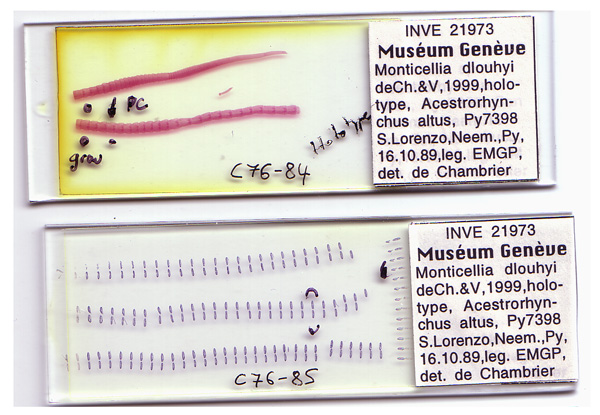 de Chambrier, A. and C. Vaucher. 1999. Proteocephalidae et Monticelliidae (Eucestoda: Proteocephalidea) parasites de poissons d’eau douce au Paraguay, avec descriptions d’un genre nouveau et de dix especes nouvelles. Revue Suisse de Zoologie 106: 165-240. (3925) Download PDF |