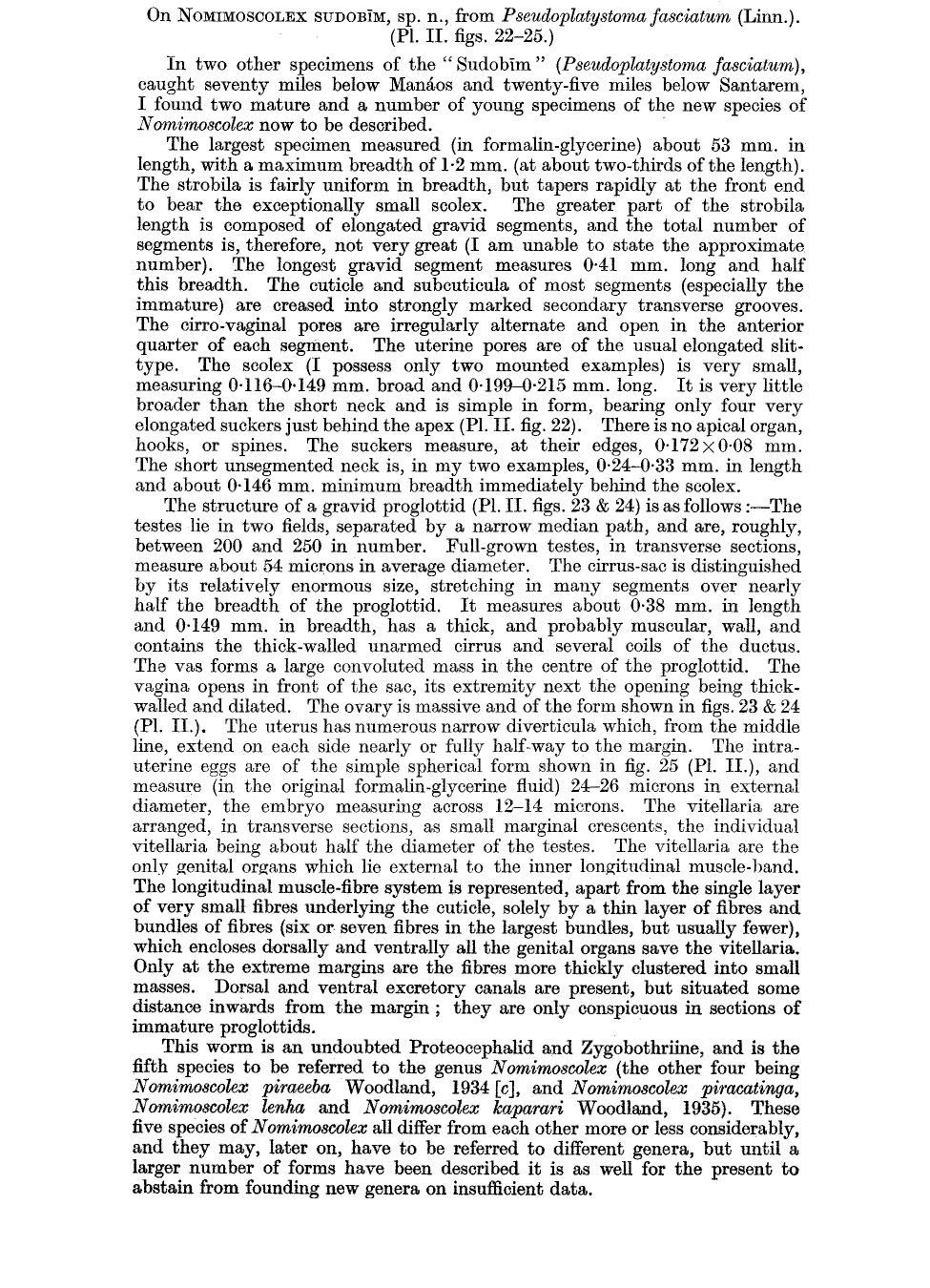 Woodland, W. N. F. 1935. Additional cestodes form the Amazon siluroids pirarara, dorad, and subobim. Proceedings of the Zoological Society of London Part 4: 851-862 +Plates . (3964) Download PDF |