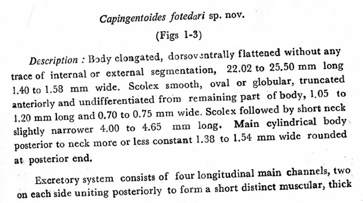 Gupta, V. and S. Parmar. 1985. Cestode parasites of vertebrates. Capingentoides fotedari, sp. nov. from a fresh water fish Clarias batrachus (Linn.) from Lucknow. Indian Journal of Helminthology 37(1): 31-35. (745) Download PDF |