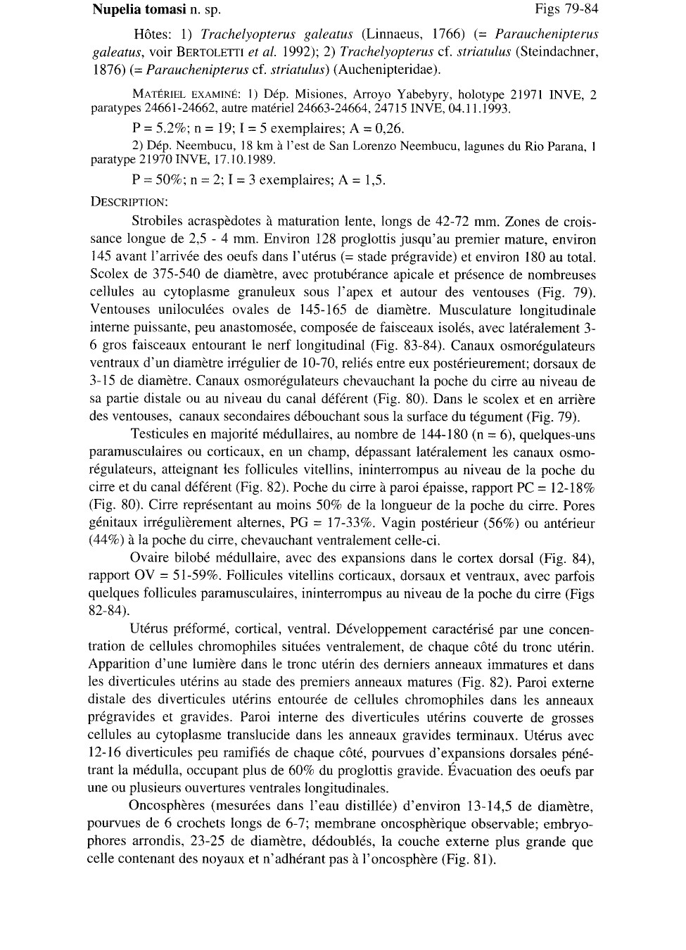 de Chambrier, A. and C. Vaucher. 1999. Proteocephalidae et Monticelliidae (Eucestoda: Proteocephalidea) parasites de poissons d’eau douce au Paraguay, avec descriptions d’un genre nouveau et de dix especes nouvelles. Revue Suisse de Zoologie 106: 165-240. (3925) Download PDF |