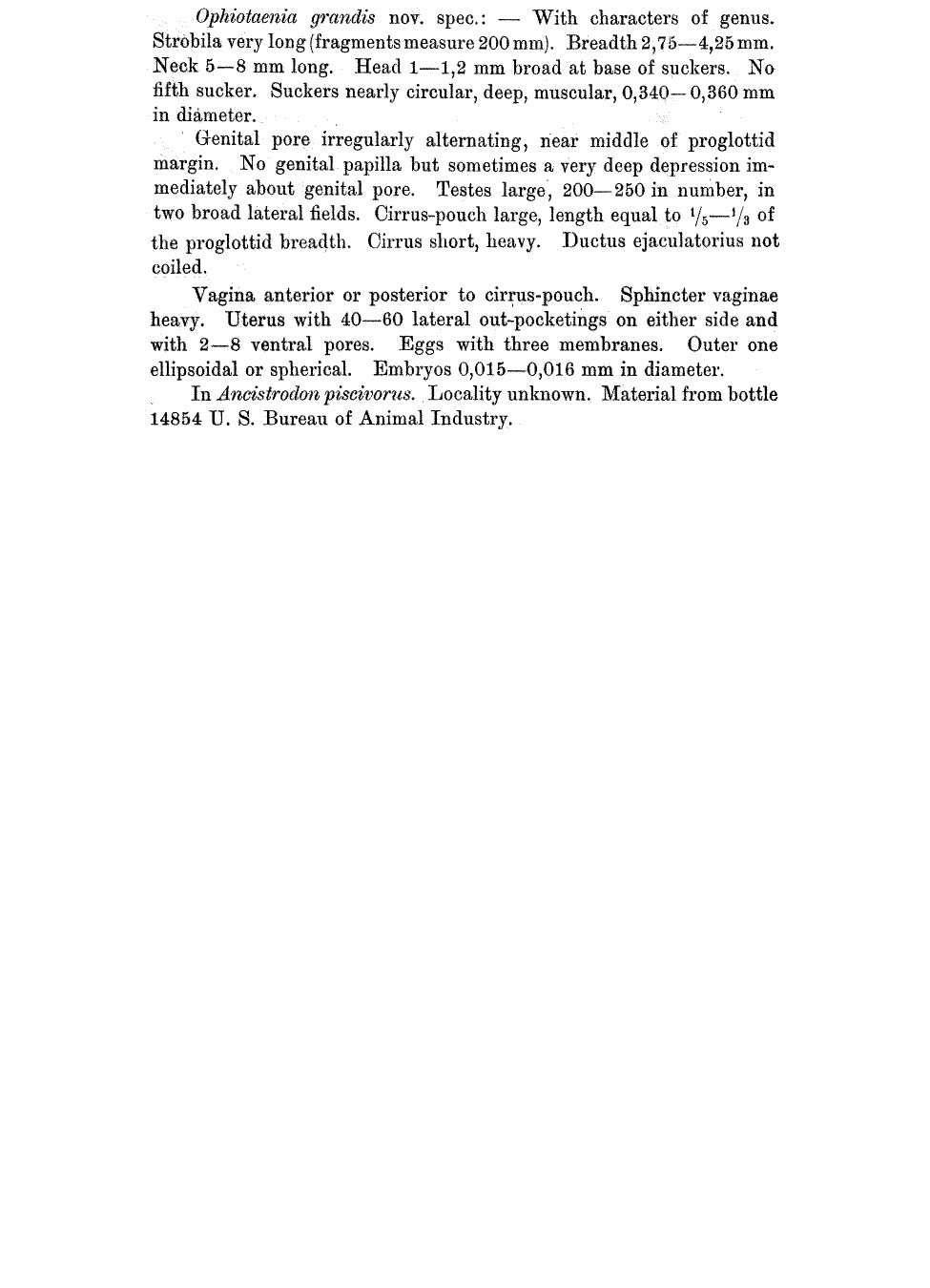 | Synonyms | Crepidobothrium grandis (La Rue, 1911) Meggitt, 1927; Proteocephalus grandis (La Rue, 1911) Harwood, 1933; Ophiotaenia marenzelleri (Barrois, 1898) La Rue, 1911 in partim; Proteocephalus agkistrodontis Harwood, 1933; Ophiotaenia ancistrodontis Harwood, 1933 in Freze (1965); Ophiotaenia agkistrodontis (Harwood, 1933) Freze, 1965 |