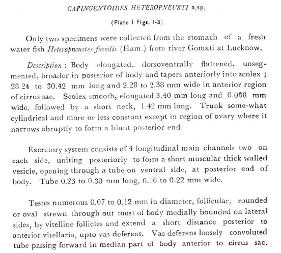 Gupta, S. P. and N. Sinha . 1979. On a new Caryophyllaeid Capingentoides heteropneusti n. sp. from the intestine of a fresh water fish Heteropneustes fossilis (Ham.) from Lucknow. Indian Journal of Helminthology 31(1): 65-68. (746) Download PDFAsh A., T. Scholz, M. Oros, C. Levron, and P. K. Kar. 2011. Cestodes (Caryophyllidea) of the stinging catfish Heteropneustes fossilis (Siluriformes: Heteropneustidae) from Asia. Journal of Parasitology 97(5): 899-907. (5945) Download PDF |