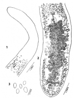 Figs. 1-3. Capingentoides heteropneusti n. sp. Fig. 1. Anterior extremity. 2. Posterior extremity. 3. Eggs.