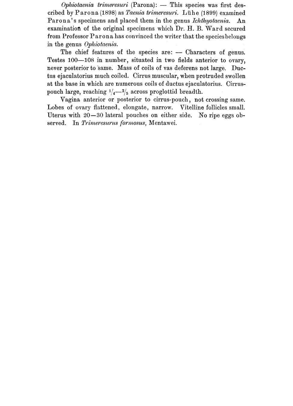 Parona, C. 1898. Elminti raccolti dal dott. Elio Modigliani alle isole Mentawei, Engano e Sumatra. Annali del Museo civico di storia naturale di Genova 39(2) v. 19: 102-124. (4087) Download PDFLa Rue, G. R. 1911. A revision of the cestode family Proteocephalidae. Zoologischer Anzeiger 38: 473-482. (3977) Download PDF |