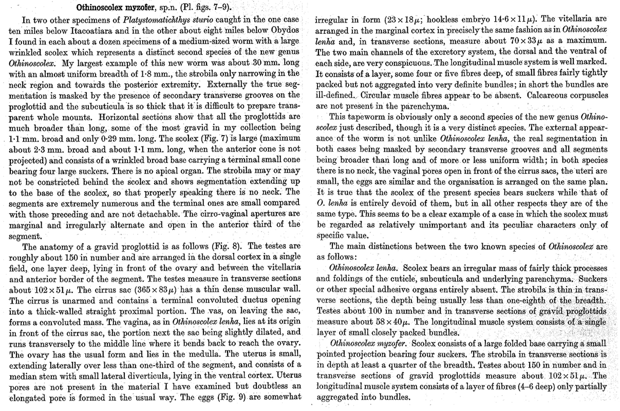 Woodland, W. N. F. 1933. On a new subfamily of proteocephalid cestodes-the Othinoscolecinae-from the Amazon siluroid fish Platystomatichthys sturio (Kner). Parasitology 25: 491-500 +Plate X. (3959) Download PDF |