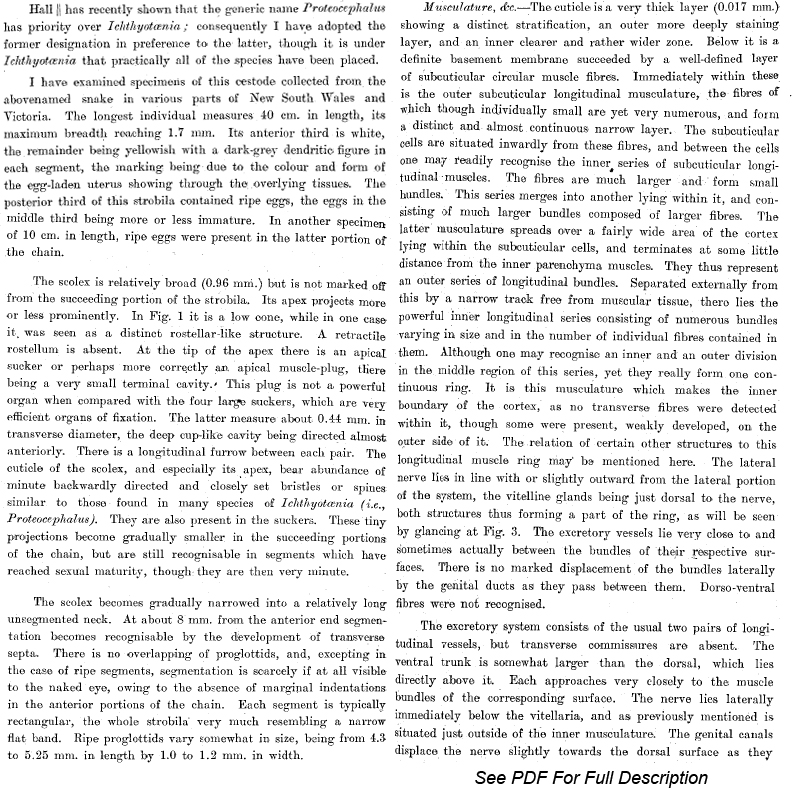 Johnston, T. H. 1911. Proteocephaus gallardi. A new cestode from the black snake. Annals of the Queensland Museum 10: 175-182.