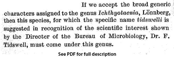 | Synonyms | Proteocephalus tidswelli (Johnston, 1909) Johnston, 1911; Ichthyotaenia tidswelli (Johnston, 1909) Beddard, 1913; Crepidobothrium tidswelli (Johnston, 1909) Meggitt, 1927 |