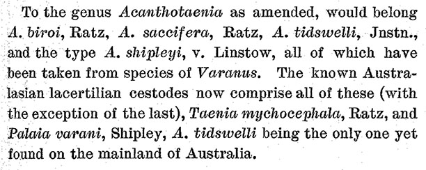 | Scientific Name Notes | Johnston (1909) originally described this species in Ichthyotaenia (pgs. 110-111) but several pages later (pg. 115) rediagnosed Acanthotaenia von Linstow, 1903 and transferred I. tidswelli Johnston, 1909 to the latter genus. |