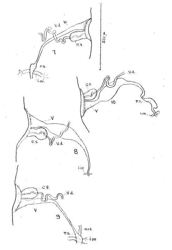 Figs. 7-10. - Proteocephalus woodlandi, sp. nov. Various positions of the cirrus-sac and the vagina and the shape of the vagina. c.s., cirrus-sac; i. ov., intraovarian bridge; ovd., oviduct; r.s., receptaculum seminis; v., vagina; v.d., vas deferens.