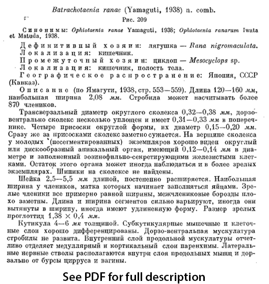 | Valid Name | Ophiotaenia ranae Yamaguti, 1938 |