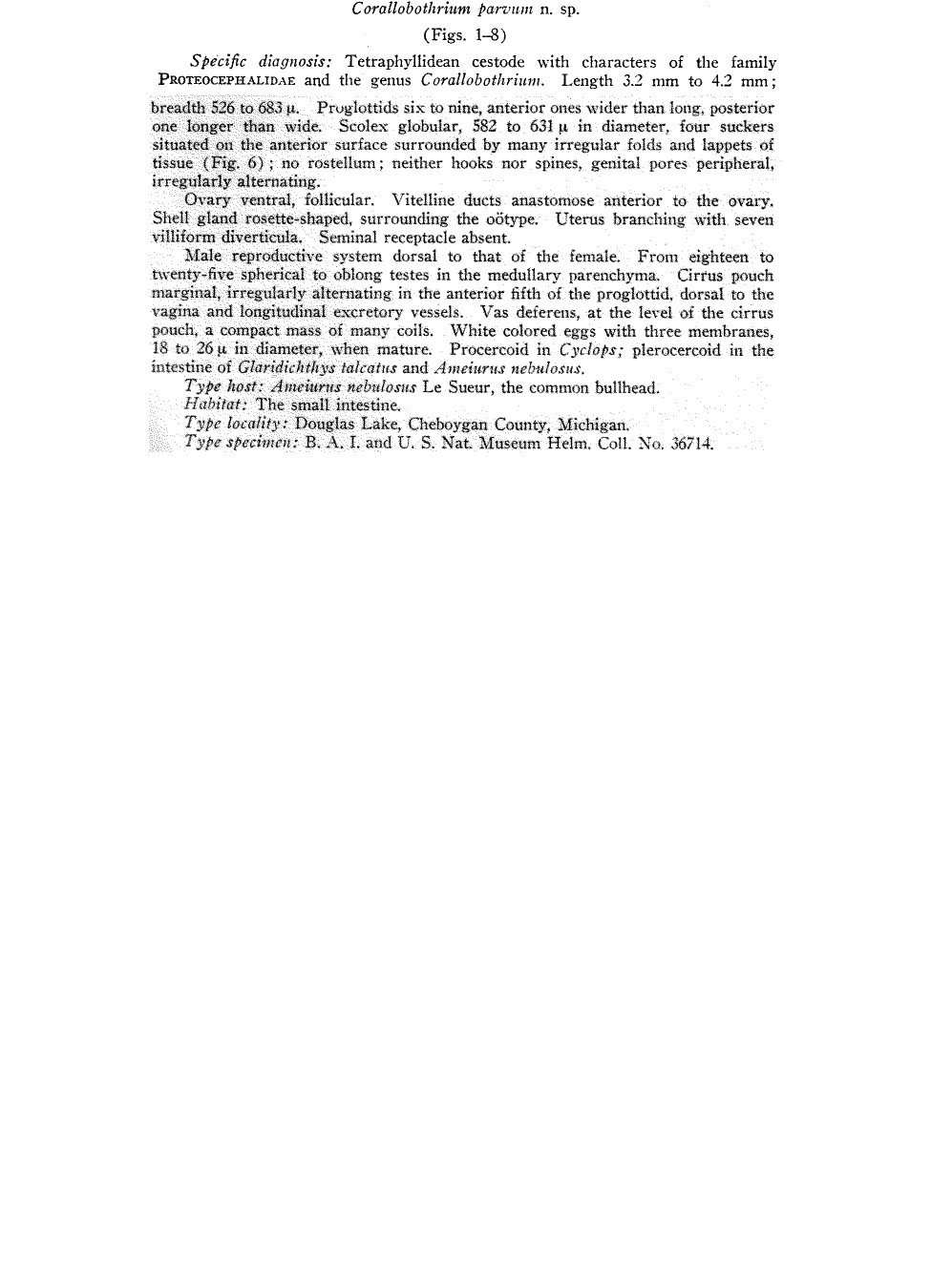Larsh Jr., J. E. 1941. Corallobothrium parvum n. sp., a cestode from the common bullhead, Ameiurus nebulosus Le Sueur. Journal of Parasitology 27(3): 221-227.