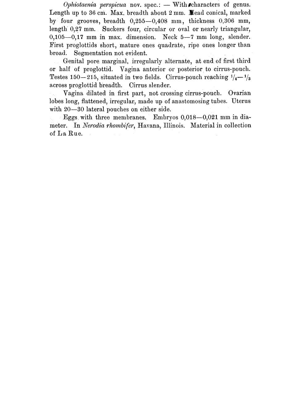 | Valid Name | Ophiotaenia perspicua La Rue, 1911 |