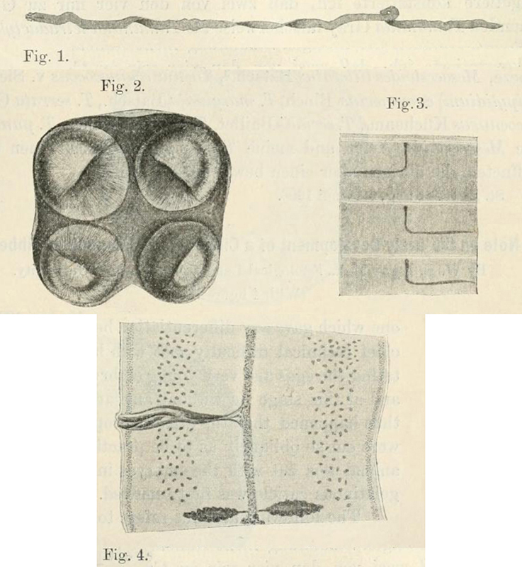 Fig. 1. Eine Strobila von Taenia punica chol. Natürliche Größe. Fig. 2. Scolex von T. punica von vorn, nach einem Balsampräparat. Fig. 3. Drei Proglottiden aus dem vorderen Drittel der Strobila von T. punica. Fig. 4. Eine Proglottis von T. punica mit entwickelten Geschlechtsorganen.