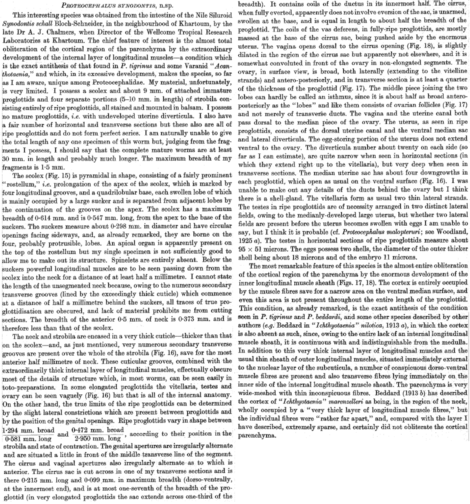 Woodland, W. N. F. 1925. On three new proteocephalids (Cestoda) and a revision of the genera of the family. Parasitology 17: 370-394. (3958) Download PDFMeggitt, F. J. 1927. Remarks on the cestode families Monticellidae and Ichthyotaeniidae. Annals of Tropical Medicine and Parasitology 21: 69-87. (4037) Download PDF |