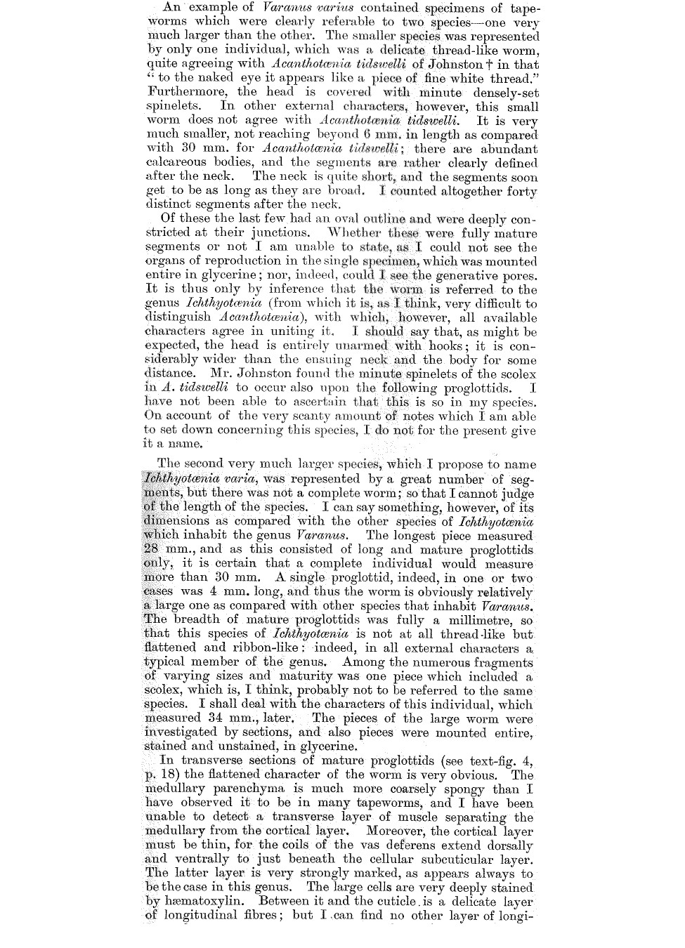 Beddard, F. E. 1913. Contributions to the anatomy and systematic arrangement of the Cestoidea. VII. On six species of tapeworms from reptiles, belonging to the genus Ichthyotaenia (s. l.). Proceedings of the Zoological Society of London 1913(1): 4-36. (3970) Download PDFMeggitt, F. J. 1927. Remarks on the cestode families Monticellidae and Ichthyotaeniidae. Annals of Tropical Medicine and Parasitology 21: 69-87. (4037) Download PDF |