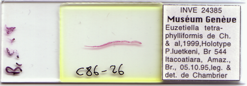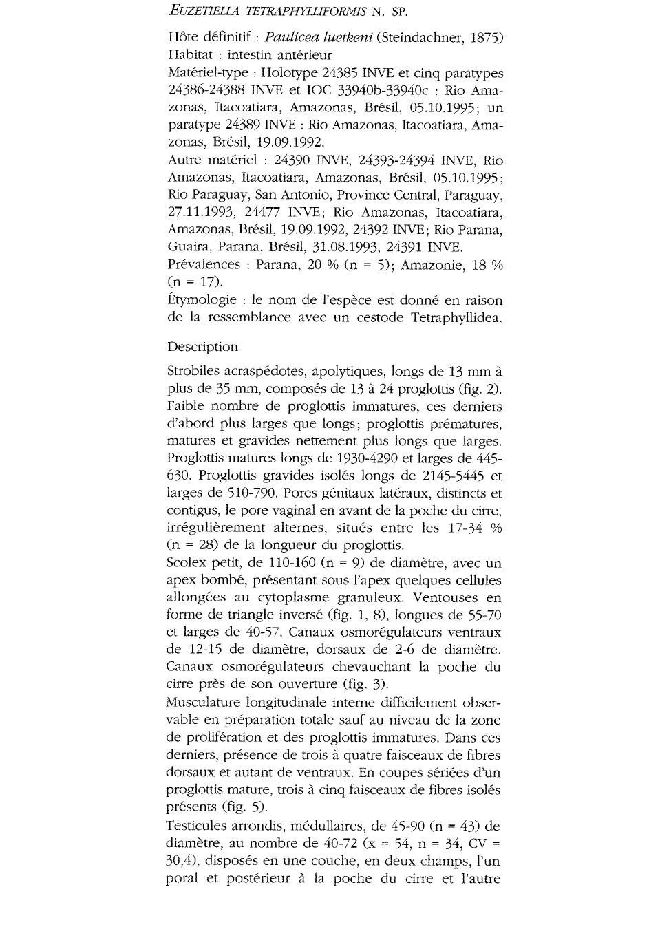 de Chambrier, A., A. A. Rego, and C. Vaucher. 1999. Euzetiella tetraphylliformis n. gen., n. sp., (Eucestoda: Proteocephalidea), parasite du poisson d’eau douce Neotropical Paulicea luetkeni (Siluriforme, Pimelodidae). Parasite 6: 43-47.