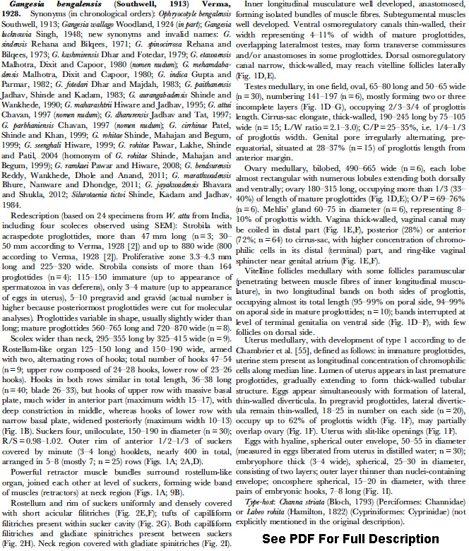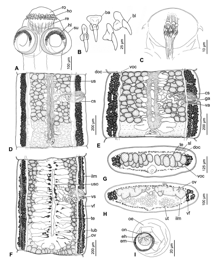 Figure 1. Gangesia bengalensis (Southwell, 1913) from Wallago attu, India. A. Scolex, dorsoventral view (MHNG-PLAT 82308, field no. AA 133B). B. Rostellar hooks (IPCAS C-616, field no. AA 133). C. Det... MoreFigure 1. Gangesia bengalensis (Southwell, 1913) from Wallago attu, India. A. Scolex, dorsoventral view (MHNG-PLAT 82308, field no. AA 133B). B. Rostellar hooks (IPCAS C-616, field no. AA 133). C. Detail of retractor muscles. D, E. Mature proglottides, ventral view (IPCAS C-616, field no. AA 133 and MHNG-PLAT 60721, field no. 147/08). F. Gravid proglottis, ventral view (IPCAS C-616, field no. AA 133). G, H. Cross sections at level of testicular field and ovary, respectively (IPCAS C-616, field no. AA 133); note that subtegumental layer is not fully illustrated. I. Egg drawn in distilled water. Abbreviations: ba - base of hook, bl - blade of hook, cs - cirrus-sac, doc - dorsal osmoregulatory canal, eh - embryonic hook, em - embryophore, ga - genital atrium, hl - hooklets, ho - hooks, ilm - internal longitudinal muscles, lub- lateral uterine branch, oe - outer envelope, on - oncosphere, ov - ovary, re - retractor muscles, ro - rostellum-like organ, sl - subtegumental layer, su - sucker, te - testes, us - uterine stem, uso - uterine slit-like opening, ut - uterus, va - vagina, vf - vitelline follicles, voc - ventral osmoregulatory canal, vs - vaginal sphincter. |