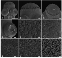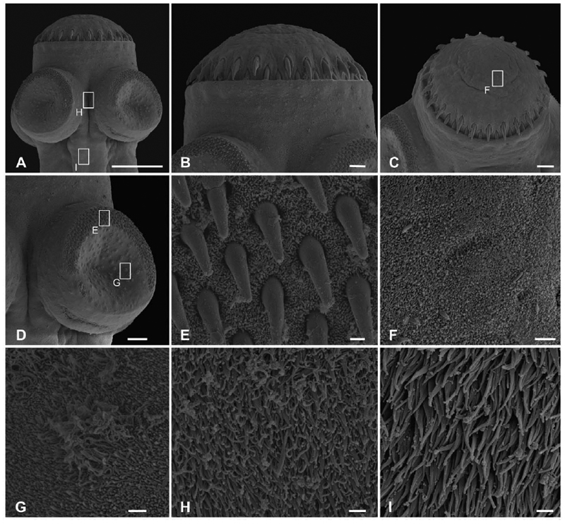 Figure 2. Scanning electron photomicrographs of Gangesia bengalensis (Southwell 1913). A. Scolex, dorsovenral view. B, C. Detail of rostellum-like organ; note two rows of rostellar hooks. D. Sucker wi... MoreFigure 2. Scanning electron photomicrographs of Gangesia bengalensis (Southwell 1913). A. Scolex, dorsovenral view. B, C. Detail of rostellum-like organ; note two rows of rostellar hooks. D. Sucker with small hooklets on the outer rim. E. Detail of the outer rim of the sucker with hooklets. F. Detail of short, dense acicular filitriches on the rostellum-like organ. G. Detail of acicular filitriches and few capilliform filitriches on the sucker. H, Detail of capilliform filitriches and small gladiate spinitriches in between the suckers. I. Detail of gladiate spinitriches on the neck region. Scale bars: A -100 µm; B -10 µm; C, D -20 µm; E-I -µm. |