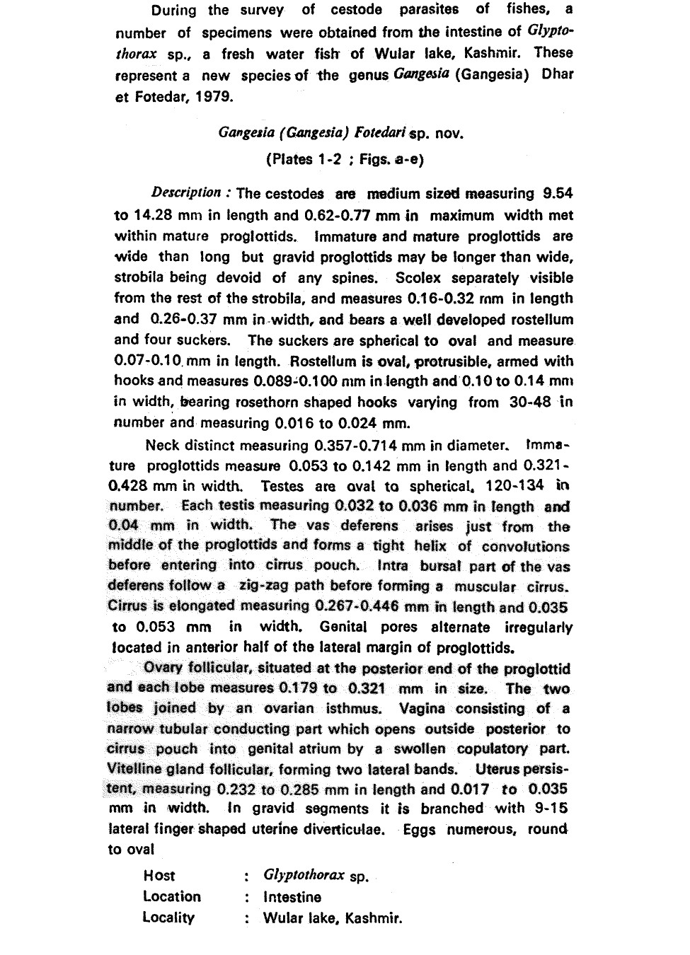 Dhar, R. L. and M. Majdah. 1983 [publ. 1984. Gangesia (Gangesia) fotedari sp. nov. (Protocephalidae: Cestoda) from a fresh water fish of Wular Lake of Kashmir. Indian Journal of Helminthology 35: 73-77. (4010) Download PDF |