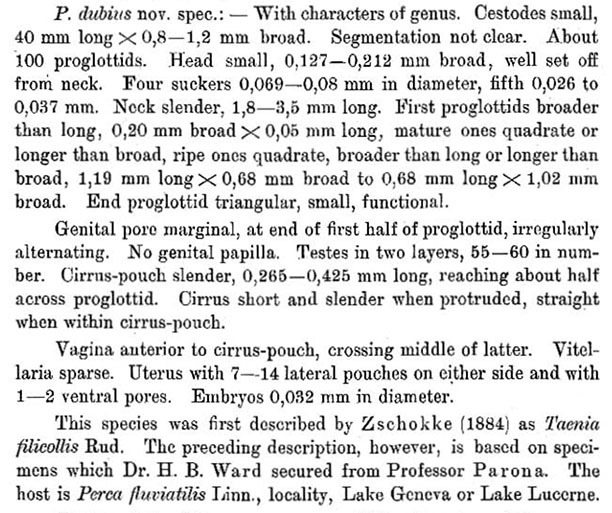 La Rue, G. R. 1911. A revision of the cestode family Proteocephalidae. Zoologischer Anzeiger 38: 473-482. (3977) Download PDFMeggitt, F. J. 1927. Remarks on the cestode families Monticellidae and Ichthyotaeniidae. Annals of Tropical Medicine and Parasitology 21: 69-87. (4037) Download PDF |