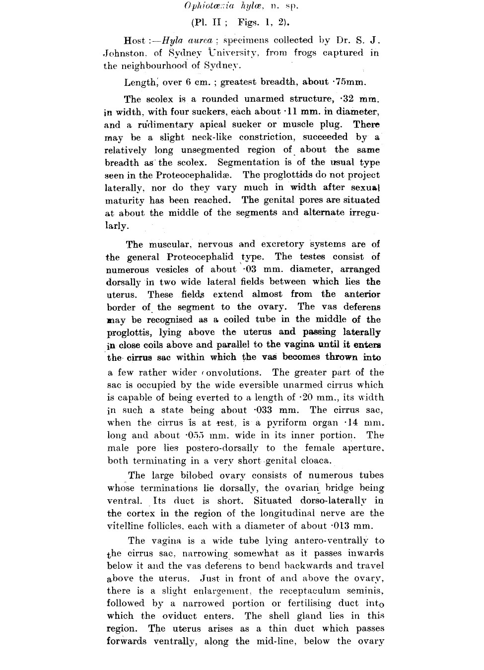 Johnston, T. H. 1912. Notes on some entozoa. Proceedings of the Royal Society of Queensland 24: 63-91. (4000) Download PDFMeggitt, F. J. 1927. Remarks on the cestode families Monticellidae and Ichthyotaeniidae. Annals of Tropical Medicine and Parasitology 21: 69-87. (4037) Download PDF |