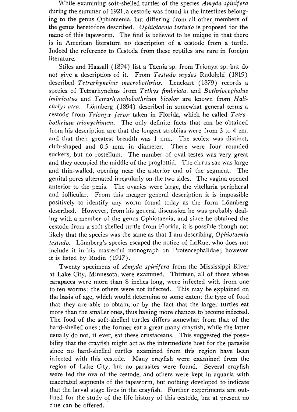 Magath, T. B. 1924. Ophiotaenia testudo, a new species from Amyda spinifera. Journal of Parasitology 11(1): 44-49. (4038) Download PDFMeggitt, F. J. 1927. Remarks on the cestode families Monticellidae and Ichthyotaeniidae. Annals of Tropical Medicine and Parasitology 21: 69-87. (4037) Download PDF |