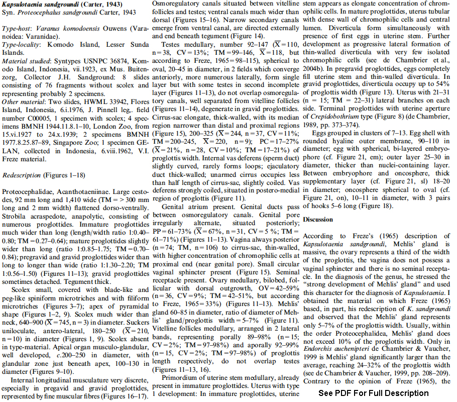 de Chambrier, A. 2006. Redescription of Kapsulotaenia sandgroundi (Carter, 1943) (Eucestoda: Proteocephalidea: Acanthotaeniinae), a parasite of Varanus komodoensis (Varanoidea: Varanidae) from Indonesia. Systematic Parasitology 63: 83-93.