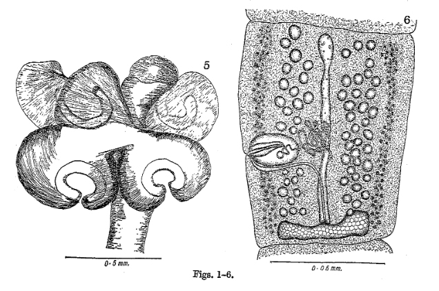 Figure 22. Macrobothriotaenia (Meggitt, 1931) from Xenopeltis unicolor. Unmounted scolex, apical view (left) and view from lower side (right), Vietnam (MHNG-PLAT 75454). |