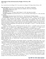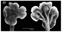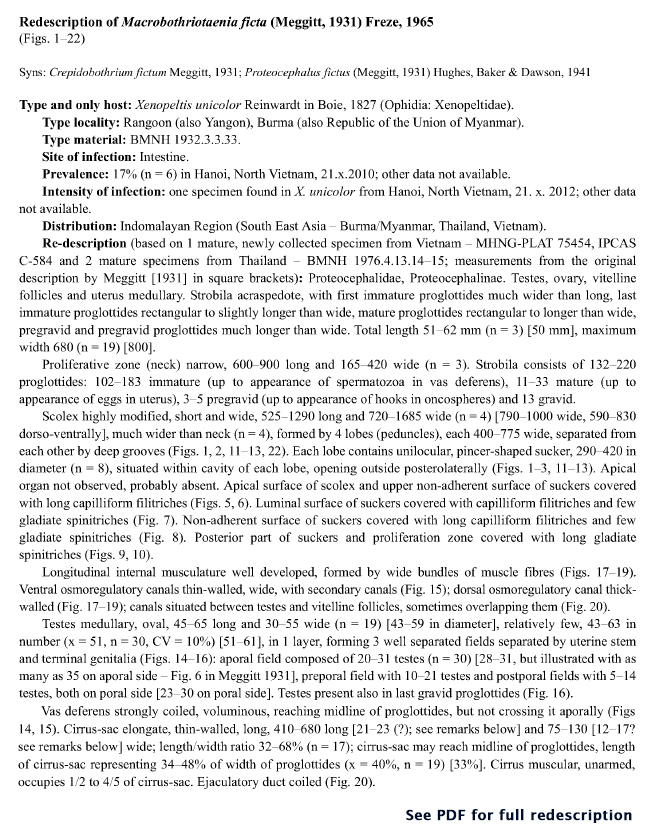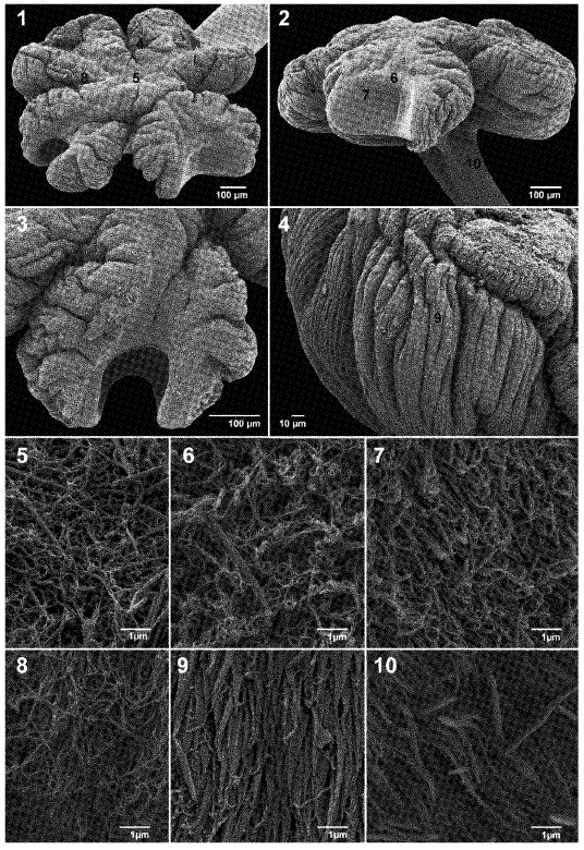 Figures 1-10. Macrobothriotaenia ficta (Meggitt, 1931) from Xenopeltis unicolor. Scanning electron micrographs. 1. Scolex, apical view. 2. Scolex, lateral view. 3. Detail of a sucker, apical view. 4. ... MoreFigures 1-10. Macrobothriotaenia ficta (Meggitt, 1931) from Xenopeltis unicolor. Scanning electron micrographs. 1. Scolex, apical view. 2. Scolex, lateral view. 3. Detail of a sucker, apical view. 4. Lower part of the exterior surface of a sucker. 5. Capilliform filitriches at level of the apex surface. 6. Capilliform filitriches at the upper marginal surface of a sucker. 7. Luminal surface of suckers covered with capilliform filitriches and few gladiate spinitriches. 8. Non-adherent surface of suckers covered with long capilliform filitriches and few gladiate spinitriches. 9, 10. Posterior part of suckers and proliferation zone covered with long gladiate spinitriches. Note: small black numbers correspond to the figures showing higher magnification images of these surfaces. Figure 22. Macrobothriotaenia ficta (Meggit, 1931) from Xenopeltis unicolor. Unmounted scolex, apical view (left) and view from lower side (right), Vietnam (MHNG-PLAT 75454). |