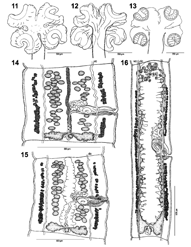 Figures 11-16. Macrobothriotaenia ficta (Meggitt, 1931) from Xenopeltis unicolor. 11-13. Flattened scolex of mounted specimens (11, 12. adult specimen. 13. juvenile specimen, Vietnam, MHNG-PLAT 45476)... MoreFigures 11-16. Macrobothriotaenia ficta (Meggitt, 1931) from Xenopeltis unicolor. 11-13. Flattened scolex of mounted specimens (11, 12. adult specimen. 13. juvenile specimen, Vietnam, MHNG-PLAT 45476). 14, 15. Mature and pregravid proglottides, respectively, dorsal view, Thailand (BMNH 1976.4.13.14-15). 16. Gravid proglottis, ventral view, Vietnam (MHNG-PLAT 75475). Abbreviations: dc - dorsal osmoregulatory canals; vc - ventral osmoregulatory canals. |