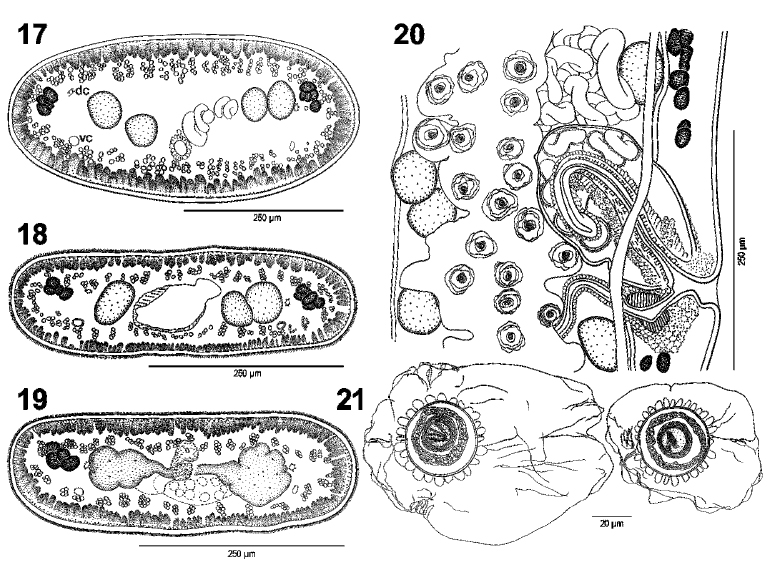 Figures 17-21. Macrobothriotaenia ficta (Meggitt, 1931) from Xenopeltis unicolor. 17-19. Cross-sections of mature (17) and pregravid (18, 19) proglottides at level of anterior part (17, 18), and at le... MoreFigures 17-21. Macrobothriotaenia ficta (Meggitt, 1931) from Xenopeltis unicolor. 17-19. Cross-sections of mature (17) and pregravid (18, 19) proglottides at level of anterior part (17, 18), and at level of ovary (19). 20. Terminal genitalia, ventral view, Thailand (BMNH 1976.4.13.14-15). 21. Eggs in distilled water, with collapsed outer hyaline envelope, Vietnam (MHNG-PLAT-75454). Abbreviations: dc-dorsal osmoregulatory canals; vc-ventral osmoregulatory canals. |