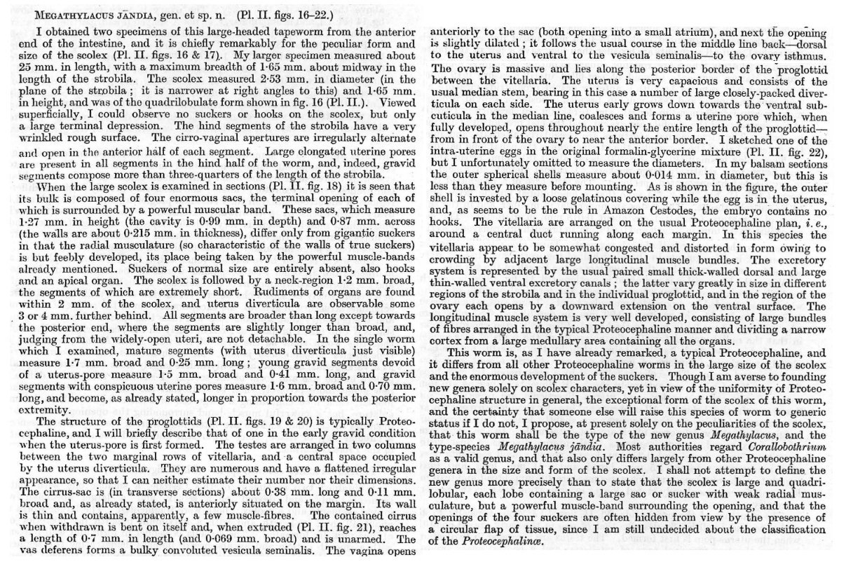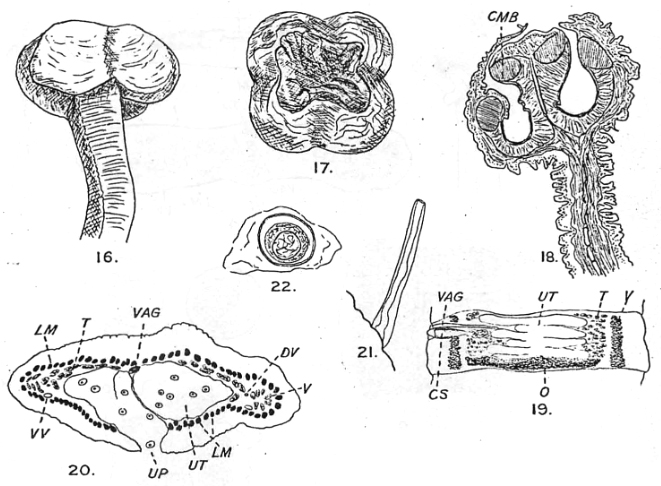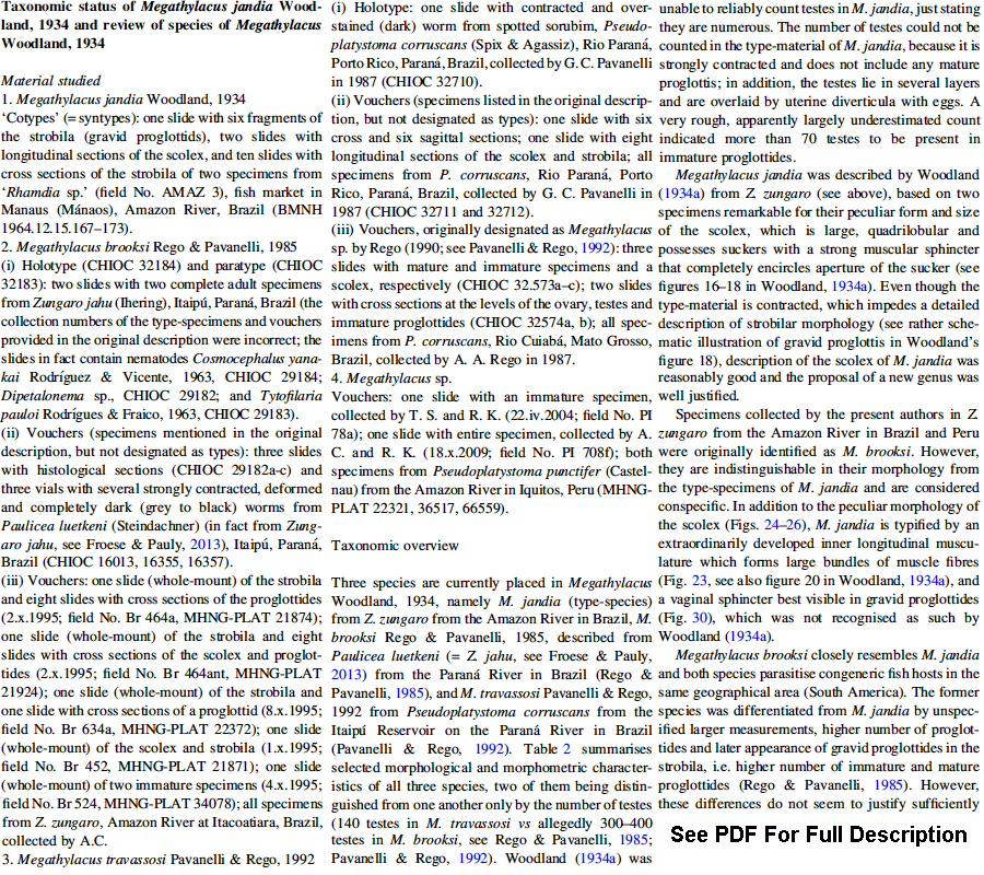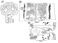 Figs. 27, 28, 30. Megathylacus spp. 27, 28, 30. Megathylacus brooksi Rego & Pavanelli, 1985 (= M. jandia Woodland, 1934) from Zungaro zungaro (27, 28) and Z. jahu (30), all from Brazil. 27, Sagittal s... MoreFigs. 27, 28, 30. Megathylacus spp. 27, 28, 30. Megathylacus brooksi Rego & Pavanelli, 1985 (= M. jandia Woodland, 1934) from Zungaro zungaro (27, 28) and Z. jahu (30), all from Brazil. 27, Sagittal section of scolex (MHNG-PLAT 21924); 28, Mature proglottis, ventral view MHNG-PLAT 22372); 30, Longitudinal section of terminal genitalia (cirrus-sac and vagina) of paratype (CHIOC 32182); note the presence of a vaginal sphincter. |