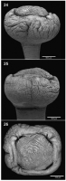 Figs. 24-26 Megathylacus brooksi Rego & Pavanelli, 1985 (= M. jandia Woodland, 1934) from Zungaro zungaro, Brazil (MHNG-PLAT 30906). Scanning electron micrographs of scoleces. 24, Lateral view; 25, Do... MoreFigs. 24-26 Megathylacus brooksi Rego & Pavanelli, 1985 (= M. jandia Woodland, 1934) from Zungaro zungaro, Brazil (MHNG-PLAT 30906). Scanning electron micrographs of scoleces. 24, Lateral view; 25, Dorsoventral view; 26, Apical view. |
