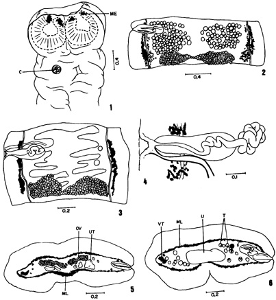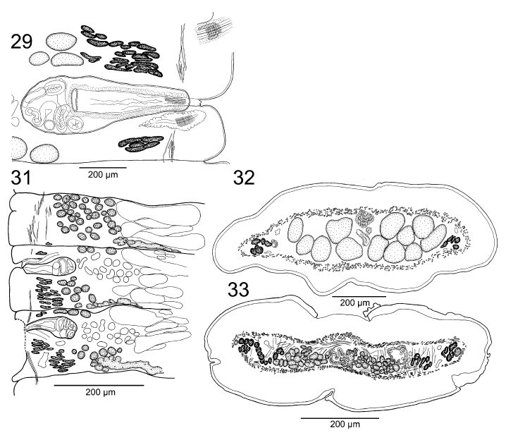 Figs. 29, 31-33. Megathylacus travassosi Pavanelli & Rego, 1992 from Pseudoplatystoma corruscans, Brazil. 29, Longitudinal section of proglottis showing the anterior and posterior position of the vagina in relation to the cirrus-sac (CHIOC 32.712); 32, Cross section at level of the postporal part of proglottis (CHIOC 32574b); 33, Cross section at level of the ovary (CHIOC 32711).