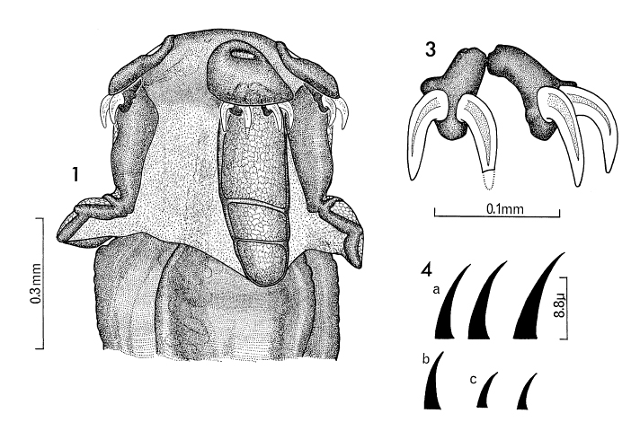 FIGURES 1, 3, 4, 7, 9, 17. Acanthobothrium americanum n. sp. 1. Scolex. 3. Hooks. 4. Cirrus spines (in profile).