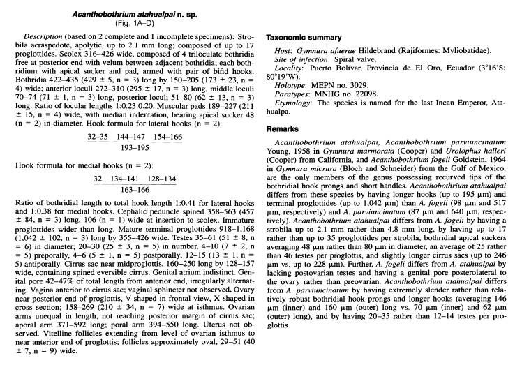 Marques, F., D. R. Brooks and R. Barriga. 1997. Six species of Acanthobothrium (Eucestoda: Tetraphyllidea) in stingrays (Chondrichthyes: Rajiformes: Myliobatoidei) from Ecuador. Journal of Parasitology 83(3): 475-484. (299) Download PDF |