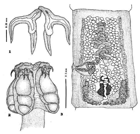FIGURES 1-3. Acanthobothrium bajaensis n. sp. 1. Hooks. 2. Scolex. 3. Mature proglottids.