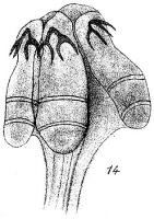 FIGURE 14. Scolex af Acanthobothrium benedeni n. sp. (2/4 Hartnack).