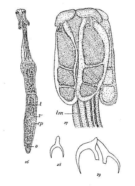 FIGURES 26-29. Acanthobothrium brevissime n. sp. 26. Strobila (actual length 1.43mm). 27. Head (lenght of head 0.25mm). 28. Single hook (actual length 0.05mm). 29. Pair of hooks, prongs broken (actual length 0.05mm).