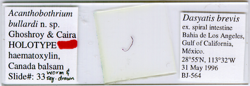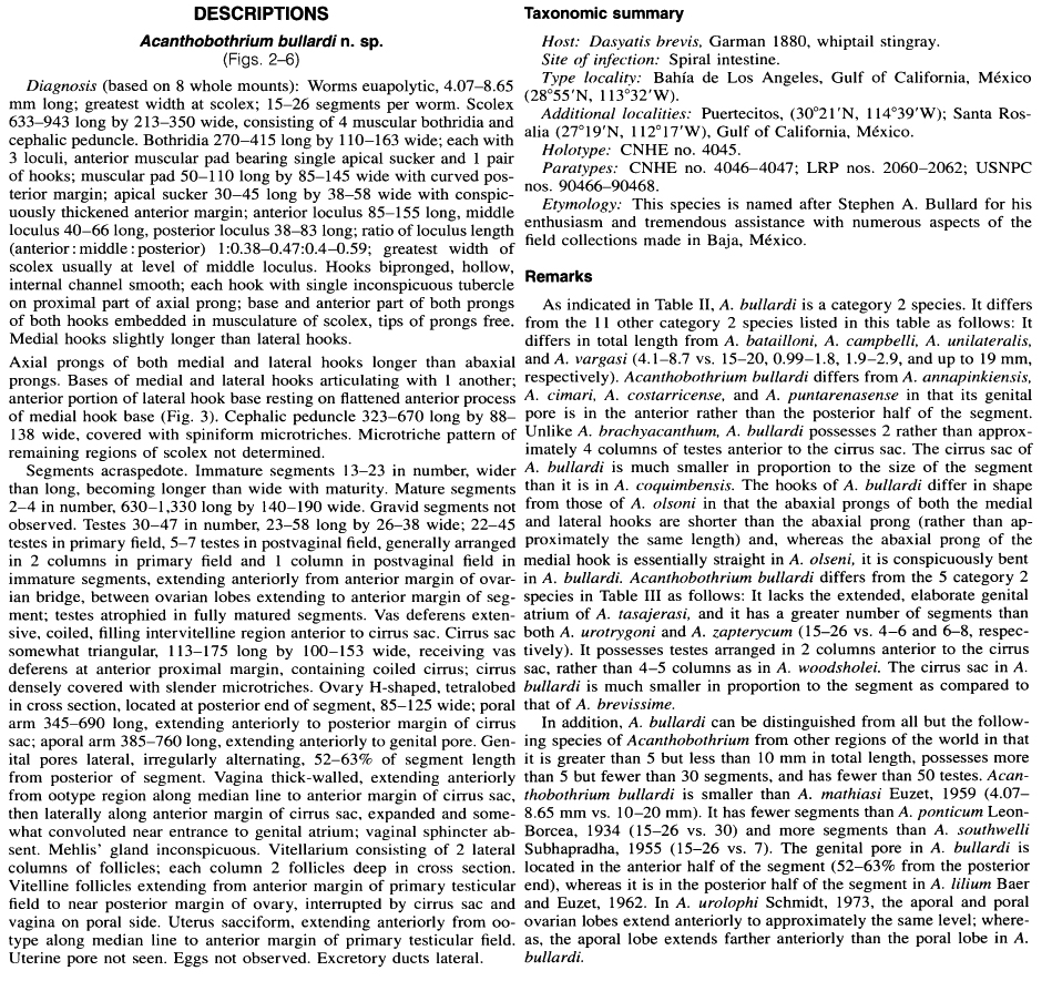 Ghoshroy, S. and J. N. Caira. 2001. Four new species of Acanthobothrium (Cestoda: Tetraphyllidea) from the whiptail stingray Dasyatis brevis from the Gulf of California, Mexico. Journal of Parasitology 87: 354-372.