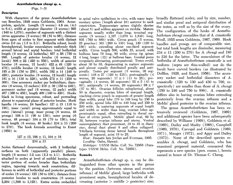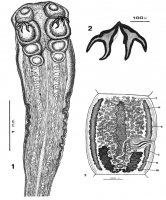 FIGURES 1-3. Acanthobothrium chengi n. sp. 1. Scolex. 2. Hooks. 3. Mature segment. Abbreviations: c, cirrus pouch; m, Mehlis’ gland; o, ovary; t, testes; u, uterus.