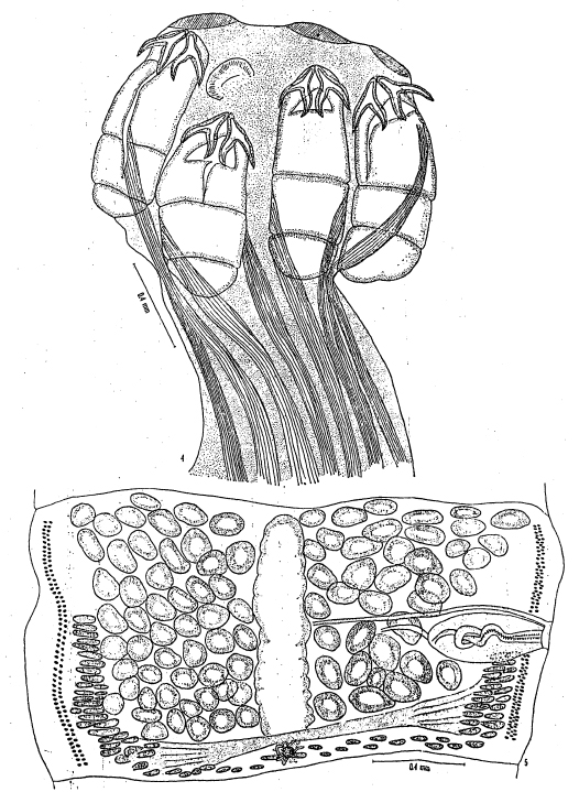 ESTAMPA II. FIGURES 4-5. Acanthobothrium chilensis n. sp. 4. Escolex. 5. Proglote maduro.