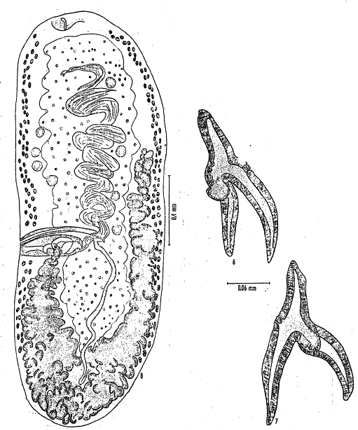 ESTAMPA III. FIGURES 6-8. Acanthobothrium chilensis n. sp. 6 and 7. Ganchos em diferentes posições, na mesma ascala. 8. Ultimo proglote do estróbilo.
