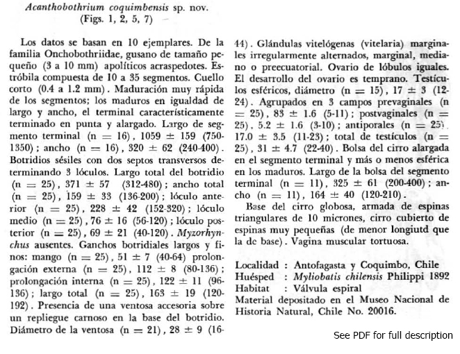 Carvajal, J. G. and J. G. Jeges. 1980. Cestodos parásitos de Myliobatis chilensis Philippi (Pisces: Myliobatidae), con la descripción de una nueva especie de Acanthobothrium. Anales del Centro de Ciencias del Mar y Limnologia 7: 51-56. (123) Download PDF |